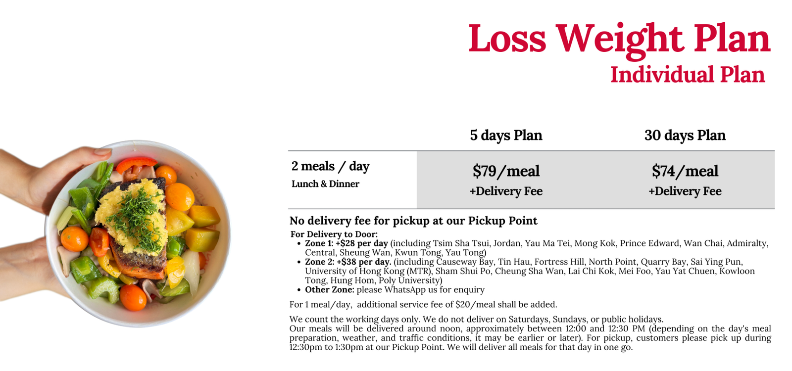 • Fresh & Delivered: Our meals are freshly prepared, chilled, and delivered right to your doorstep in Hong Kong—no cooking required.